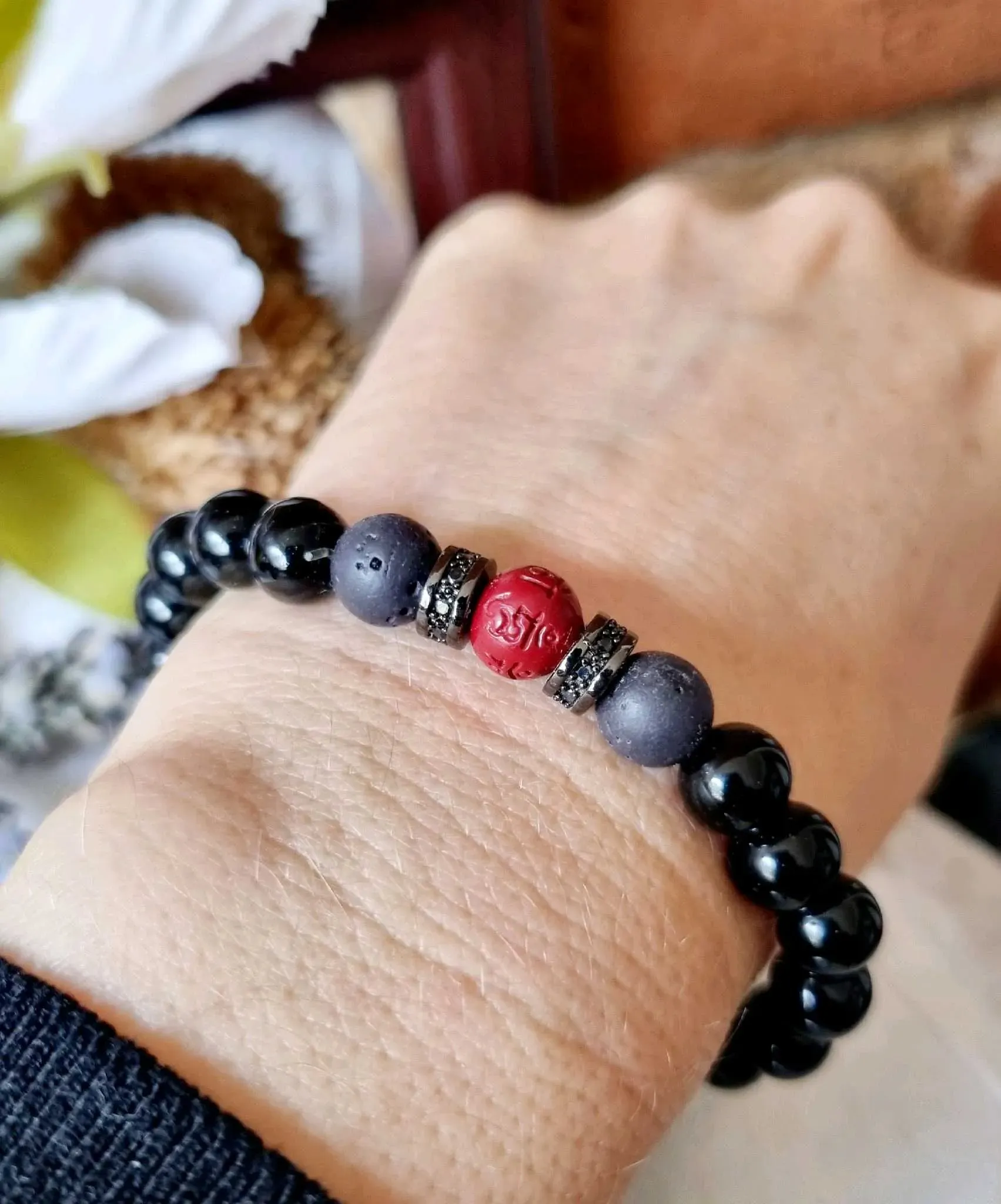 Pulsera única de cinabrio, volcánica y ónix con elegantes toques de acero negro. Hecha a mano con resorte para un ajuste perfecto. Esta pulsera combina la belleza natural de las piedras con un diseño moderno y sofisticado. ¡Luce estilo y distinción con esta pieza exclusiva!