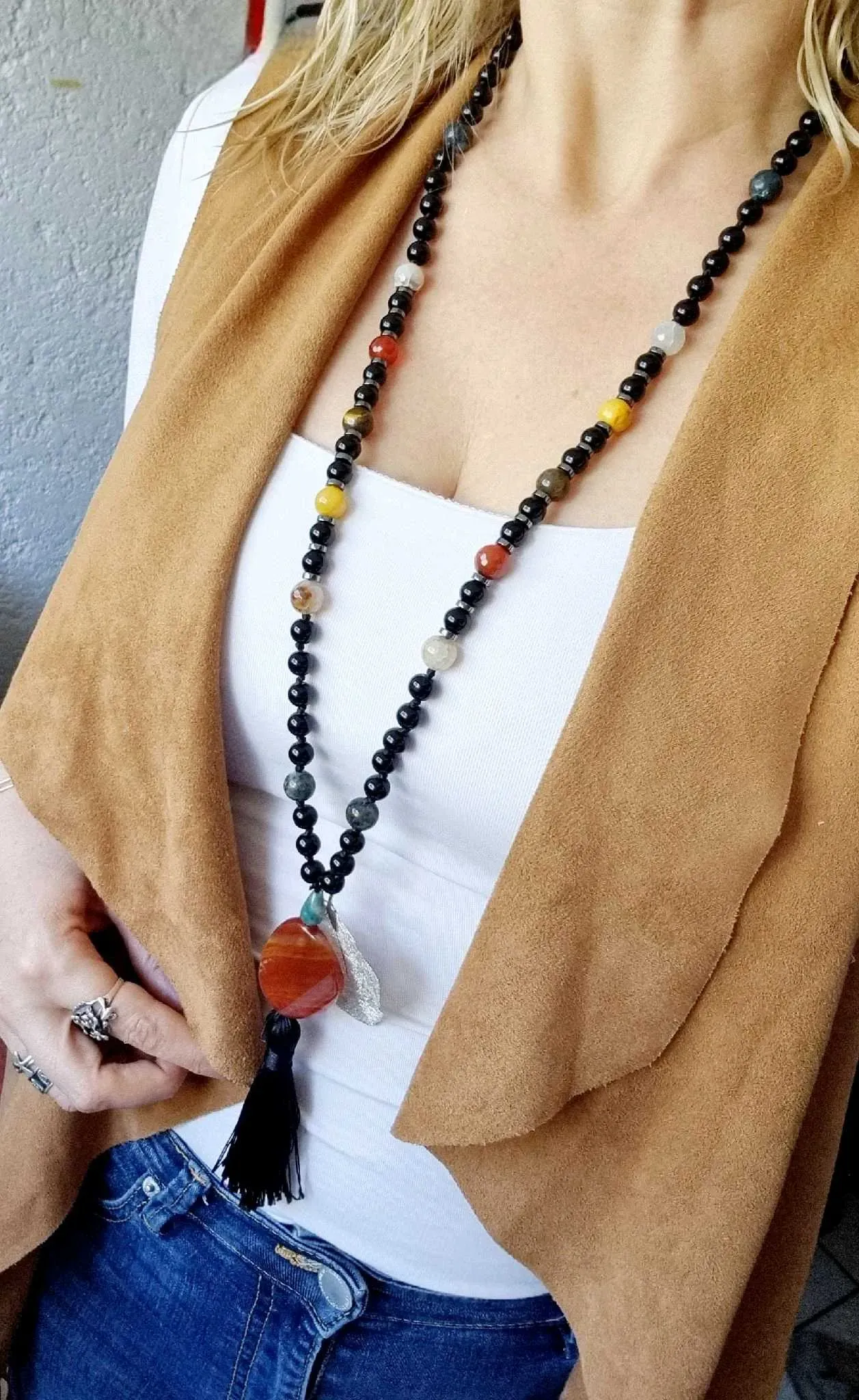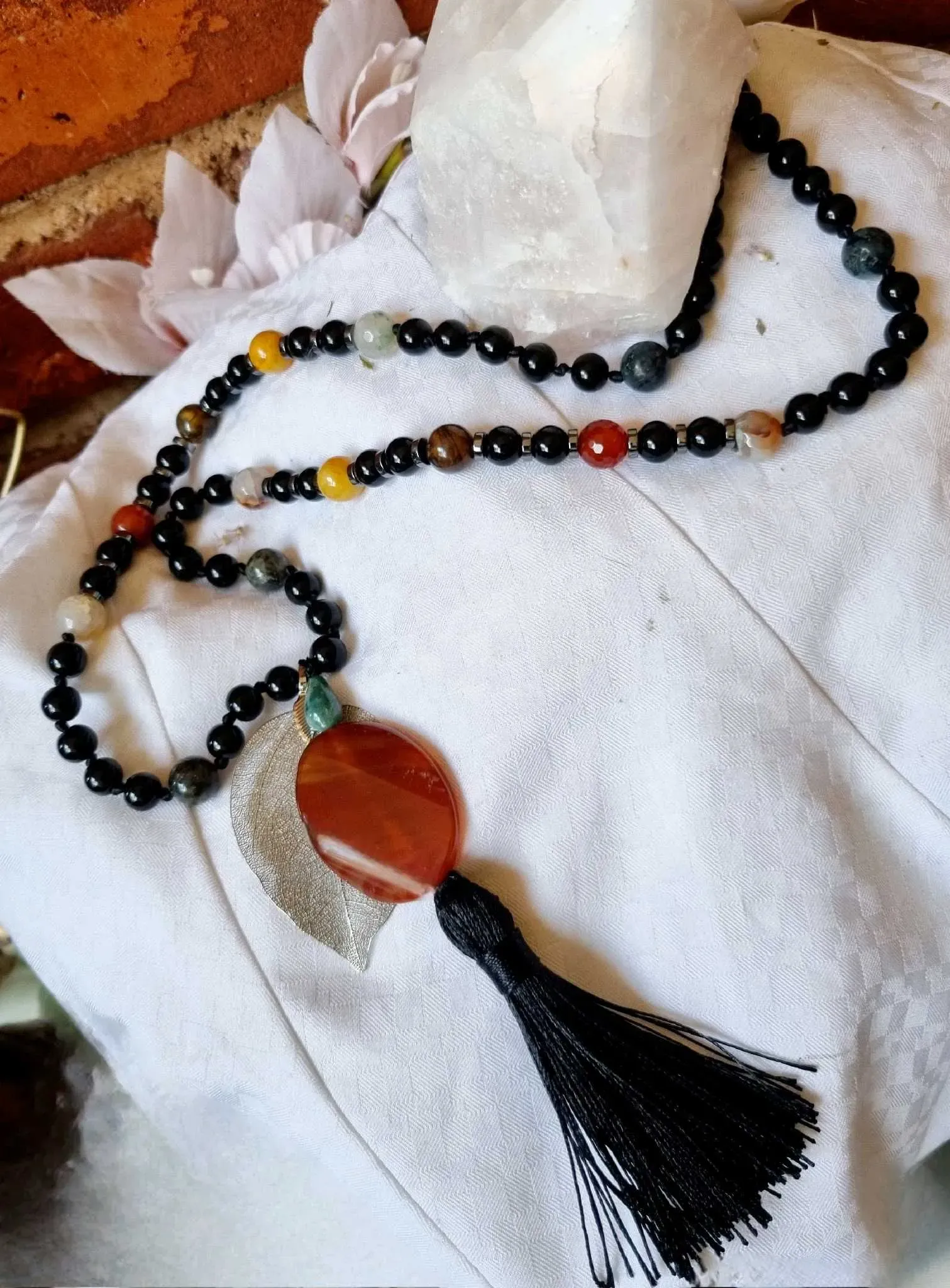Collar 'Otoño' con piedras naturales como onix, labradorita, hematite, agata y ojo de baño de plata. Este collar de 1 metro es una pieza única que combina la belleza de la naturaleza con un toque de elegancia. Perfecto para agregar un toque de estilo a tu outfit.