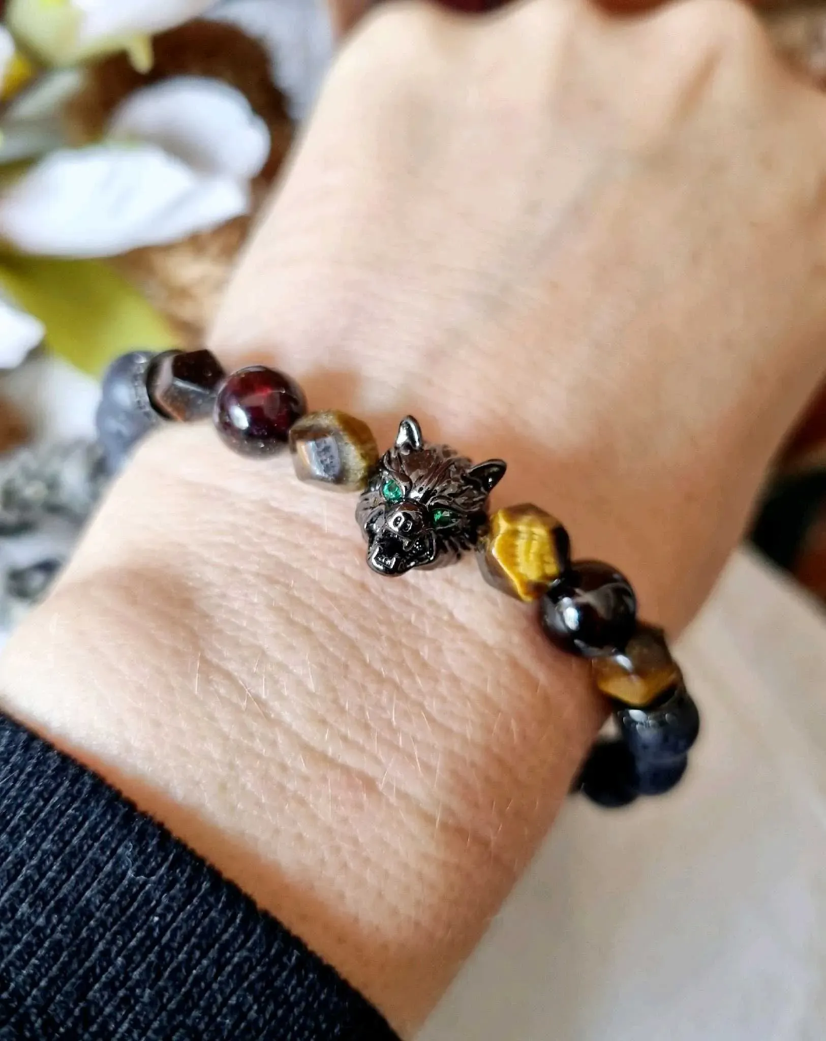 Luce elegante y enérgico con esta pulsera de piedra natural con detalles de lobo, ojo de tigre, granate y ónix. Hecha con acero y elástico para un ajuste cómodo. Añade un toque de estilo único a tu look diario con esta pulsera artesanal.
