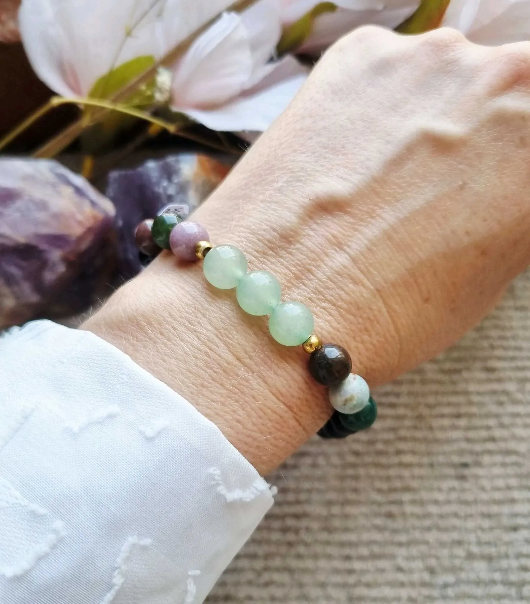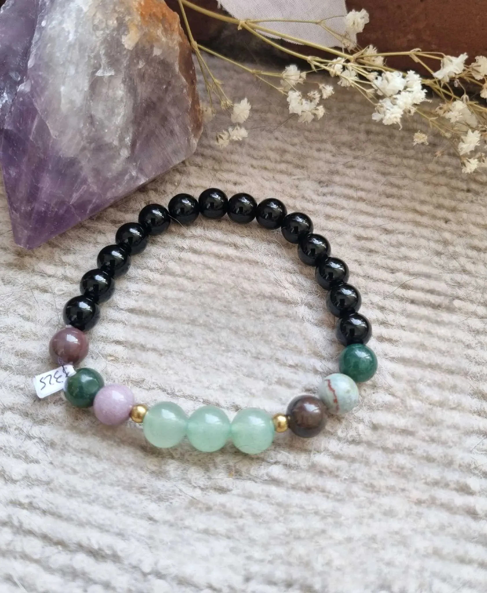 Lleva contigo la elegancia y protección con esta pulsera de ágatas y ónix. Hecha a mano en México, esta pulsera con resorte es perfecta para añadir un toque de estilo único a tu atuendo. Las propiedades curativas de las ágatas y la energía protectora del ónix se combinan en esta joyería artesanal.